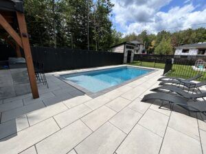 - Marches extérieures : installées à l’extérieur du bassin, elles permettent d’optimiser la surface de baignade tout en ajoutant un élément fonctionnel et esthétique à l’aménagement. Le trottoir et l’aménagement autour de la piscine